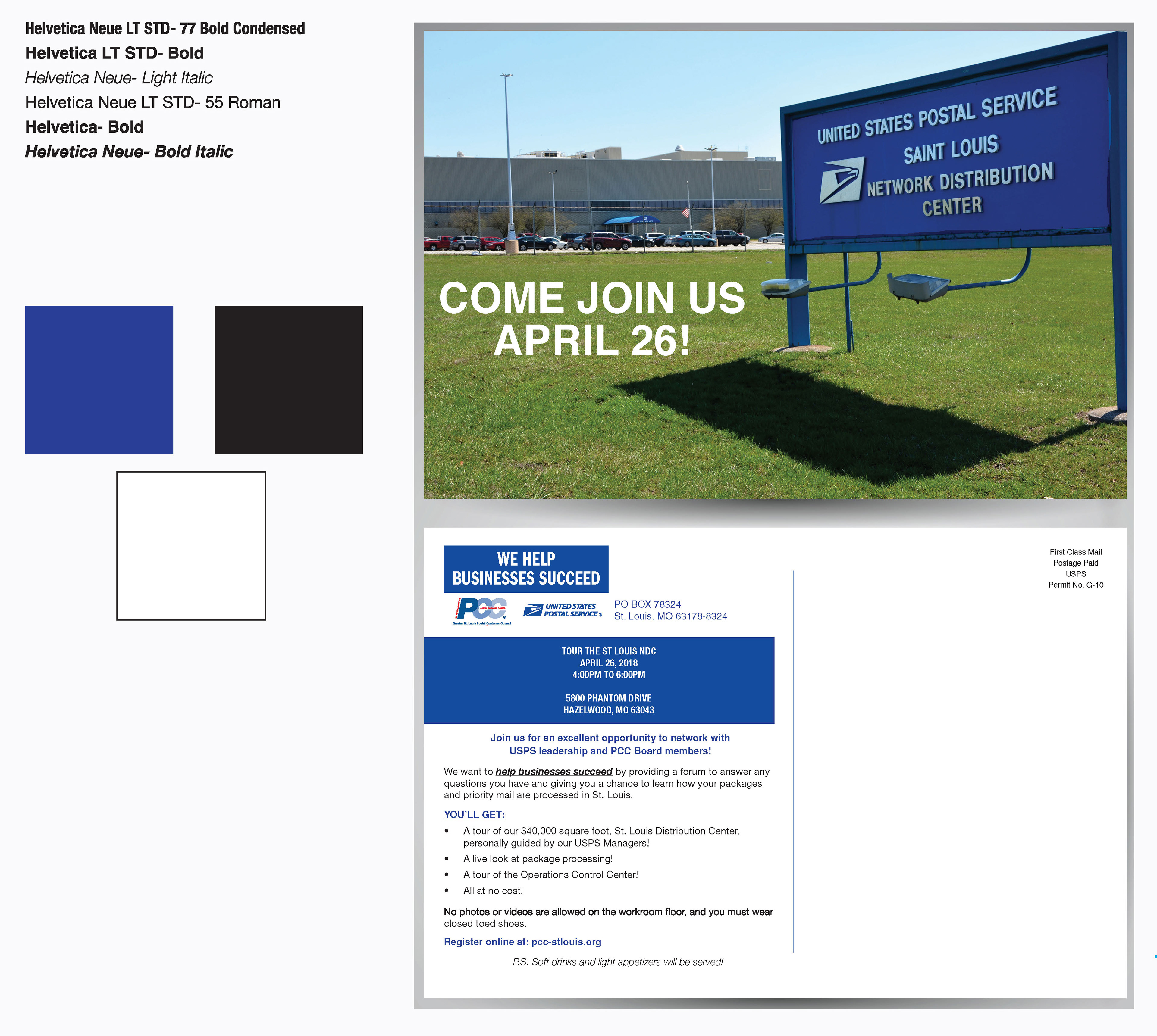 The United States Postal Service of Saint Louis asked for the designing of a postcard they could send to clients to promote a tour of their Network Distribution Center.